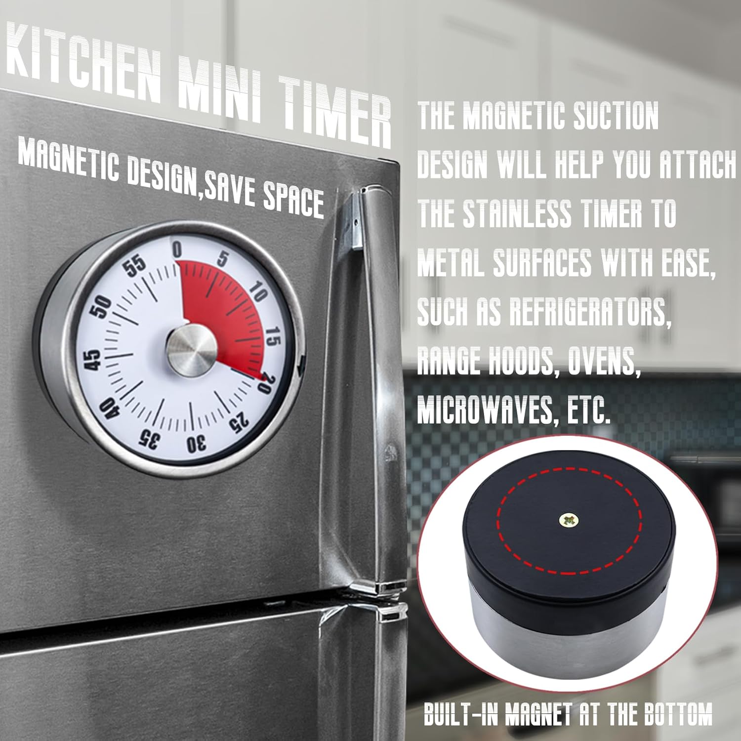 The magnetic suction design will help you attach the stainless timer to metal surfaces with ease, such as refrigerators, range hoods, ovens, microwaves, etc. The kitchen timer will stay firmly in place, so you won't have to worry about it falling off. The magnetic visual timer is the perfect choice for convenience